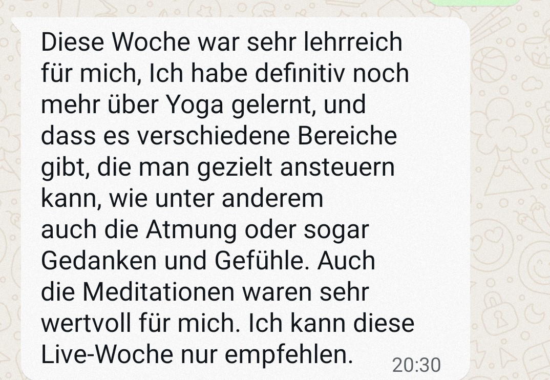 „Es war definitiv eine unglaubliche Erfahrung, die ich sehr gerne wiederholen möchte! Mir fehlen die Worte, um die Unterstützung, die Geduld und die Motivation zu beschreiben, die unsere Yogalehrerin Ute uns entgegengebracht hat. Sie hat mich motiviert, weiter Yoga zu praktizieren und mich inspiriert, ein Leben mit Sinn zu führen. Herzlichen Dank Ute!“
