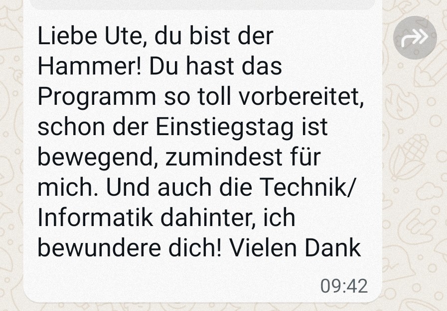 "Die Begegnung mit Ute war eine Entdeckung. In sehr kurzer Zeit hat sie meinem Körper geholfen, die verlorene Kraft wiederzuerlangen. Ich habe großes Vertrauen in ihr Wissen und ihre Weisheit, sie bringt einen mit positiver Bestärkung voran und respektiert die Zeit, die man braucht. Endlich sehe ich das Licht nach einem langen Weg der Krankheit. Danke, danke, danke, danke."