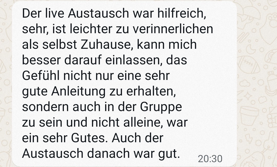 Du schaust in die Videos rein und machst ab und das, was du magst mit oder später nach. Du kommst zu den Live Zoom Abenden und machst die Übungen live mit der Gruppe mit.